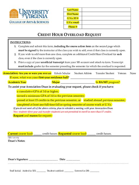 Uva Course Overload Form. Course action form enroll in more than 19 credit hours for the semester: Web in order to enroll in two courses with overlapping schedules, the student must obtain approval from the instructors of both courses via email.