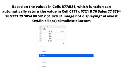 =lowest () =min () =floor () =smallest () =bottom () answer is =min () the. The value in cell c77 can be automatically returned by using the autoformulate function. The min function in an excel sheet automatically returns the. The value in cell c77 can be automatically returned by using the autoformulate function. Web let's take a look at some of the functions available in these applications that can automatically return the value in a cell. You don’t need to know the formula to use this function. How do you return a value in excel? =floor) =smallest =bottom apr 01. Web web the lookup function lets you find a value in a cell range and return a corresponding value on the same row. Web the function that can automatically return the value in cell c77 is c.