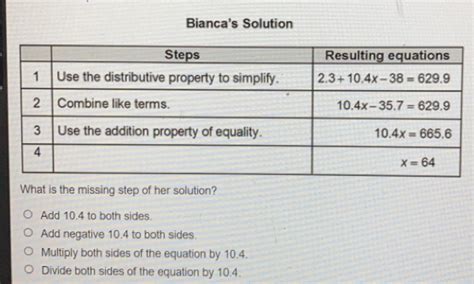 What Is The Missing Step Of Her Solution. Simplify by using addition property of equality. (a)simplify by combining like terms.