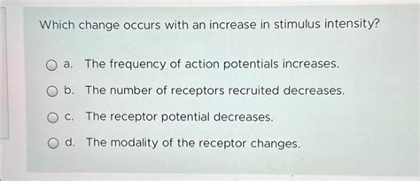 When The Stimulus Intensity Is Increased What Changes. Web when the intensity of the stimulus is increased, the size of the action potential does not become larger. Web if n is greater than 1, then the slope (rate of change of perception) is getting larger as the stimulus gets larger, and sensitivity increases as stimulus intensity increases.