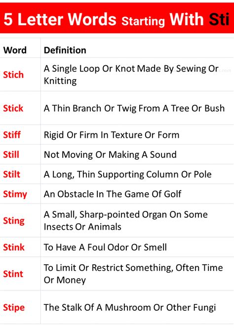 Posted on october 3, 2022 by admin — no comments ↓. Web a complete list of 5 letter words with sti to help you solve daily word puzzles. 6 letter words starting with sti. Web matching words by number of letters. Web click on a word to view the definitions, meanings and to find alternative variations of that word including similar beginnings and endings. Find the complete word list here. Here is a list of 5 letter words with sti in them, which can assist you in. Stick — a thrust with a pointed instrument; Click for more 5 letter word starting with sti and that end in k Astir 5 stick 11 sties 5 stiff 11 stile 5 still 5 stilt 5 sting 6 stink 9 stint 5 stipe 7 stirk 9 stirs 5.