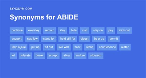 Web find 1,276 synonyms for abide and other similar words that you can use instead based on 8 separate contexts from our thesaurus. Need synonyms for abide by? Accept, stand for, tolerate, acknowledge, bear, and concede. Here's a list of similar words from our thesaurus that you can use instead. Goes, leaves, departs, moves, exits, goes off, quits, takes off Remain, stay, wait, dwell, hang around, stick around, tarry, await; Last (beyond), persist (beyond), hold (past), endure (past), hold out (past), draw out, perpetuate, survive, outstay, succeed Leave, move, go, depart, quit, take off, cut out, get off Remains, stays, waits, dwells, hangs around, tarries, sticks around, lingers; Enduring, immortal, ongoing, eternal, continuing, lasting, perpetual, perennial;