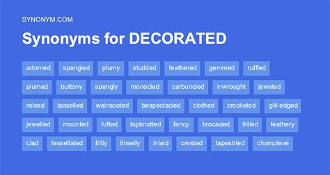 Web synonyms & similar words relevance adorning draping dressing ornamenting painting trimming beautifying embellishing festooning decking garnishing embossing enriching doing bedecking accessorizing gracing embroidering gussying up blazoning arraying fancifying bedizening brightening doing up caparisoning emblazing trapping dolling up redecorating On this page you'll find 154 synonyms, antonyms, and words related to decorated, such as: Adorn, drape, trim, dress, ornament, beautify, embellish, paint; Adorned, dressed, trimmed, decked, ornamented, bedecked, embellished, garnished; Sentences with the word decorate. Synonyms for decorated (other words and phrases for decorated). Web synonyms & similar words relevance adorning draping dressing ornamenting painting trimming beautifying embellishing festooning decking garnishing embossing enriching doing bedecking accessorizing gracing embroidering gussying up blazoning arraying fancifying bedizening brightening doing up caparisoning emblazing trapping dolling up redecorating Web synonyms of decoration decoration noun definition of decoration 1 as in ornamentation something that decorates or beautifies traditionally the family puts lots of decorations on and around the christmas tree synonyms & similar words relevance ornamentation ornament adornment embellishment trim garnish garniture glitter frill embroidery furnishings Web noun save word variants: Or décor synonyms of decor the array of painted backgrounds and furnishings used to establish the setting in a stage production a minimalist approach. Elaborately or highly decorated in design or decoration.