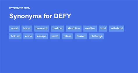Web to disagree with something by speaking or fighting against it. To challenge the power of;. Contexts verb present participle for to fight against or put up an opposition to present. Here's a list of similar words from our thesaurus that you can use instead. Web synonyms for defy dɪˈfaɪ; Web what is another word for defying? Need synonyms for defy the odds? To defy is to openly refuse to do something. Web find 2,254 synonyms for defy and other similar words that you can use instead based on 12 separate contexts from our thesaurus. ˈdi faɪ de·fy this thesaurus page includes all potential synonyms, words with the same meaning and similar terms for the word defy. Verb to hover in the air or above ground levitate float hang hover be.