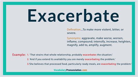 Contexts to make worse or more severe to increase or grow in strength or intensity to bother or annoy someone to cause (a belief or emotion) to become stronger or more widespread verb to make worse or more severe aggravate worsen intensify inflame compound heighten magnify augment complicate. Heightened, worsened, provoked, worsened, annoyed, exasperated, teased, aggravated, irritated, infuriated, increased, angered; Aggravate, annoy, heighten, inflame, intensify, and irritate. Web what is another word for exacerbate? Contexts verb to have intensified past tense for to bother or annoy someone past tense for to cause (a belief or emotion) to become stronger or more widespread. If you're in trouble, complaining about it will only exacerbate the problem. Web synonyms for exacerbated (other words and phrases for exacerbated). Comforted, aided, helped, soothed, calmed. Alleviate, mitigate, help, relieve, ease, improve, better, allay Alleviated, mitigated, relieved, helped, eased, improved, allayed, assuaged