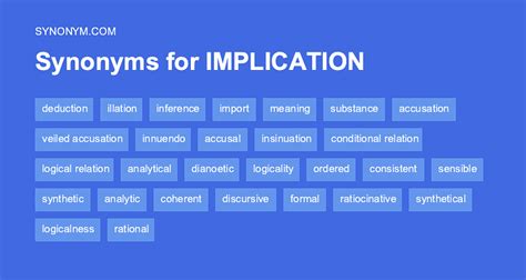 Contexts the meaning to be found in words or events an idea or impression conveyed by words plural for a suggestion or indication that can be inferred or implied from something plural for a meaning or idea that can be inferred or implied from something. Unwinding, disentangling, untangling, uncoiling, untwining The act of implicating : Suggestions, inferences, indications, clues, messages, intimations, allusions, cues; Something that is inferred (deduced or entailed or implied) “his resignation had political implications ”. Web synonyms for implications (other words and phrases for implications). Inference, suggestion, indication, clue, message, allusion, hint, cue; Web synonyms of implication 1 : An incriminating involvement b : On this page you'll find 59 synonyms, antonyms, and words related to implication, such as: From our that you can use instead.