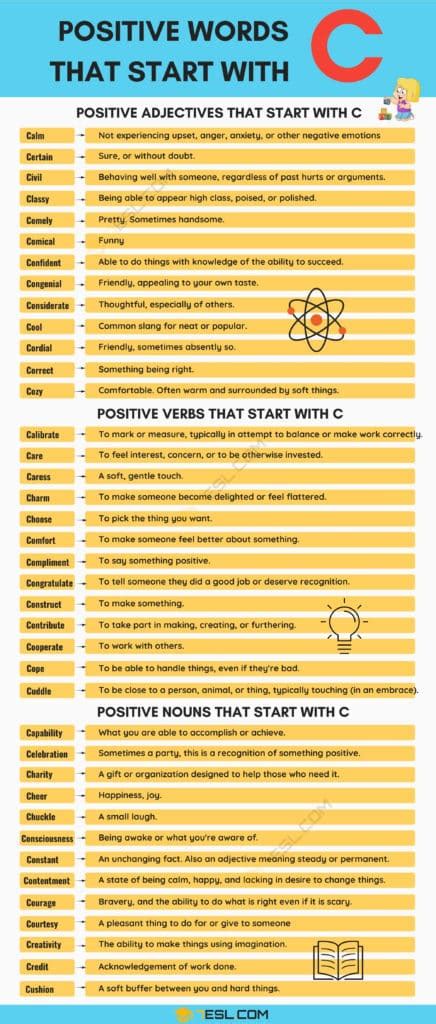 Web nice, kind, and positive words that start with the letter c — cadence; Positive words that start with letters from a to z. Web positive words that start with c. Use this research when you need information related to nice words that start with c, good words that start with c, aesthetic words that start with c, cute words that start with c, good words starting with c,. Web 85 positive words that start with the letter c. Web check out our amazing list with more than 6000 positive words and phrases: Web 3 letter words that start with c cab cad cal cam can cap car cat caw cay cee cel cep cha chi cie cig cis cit cob cod cog col con coo cop cor cos Positive words that start with c to compliments others. Positive words that start with c to encourage yourself.