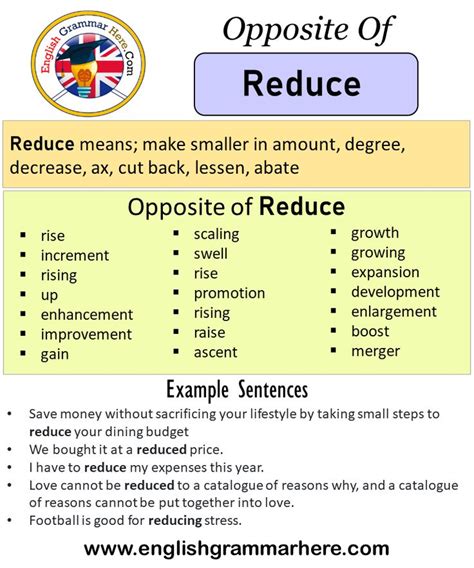 Promote, raise, advance, elevate, hire, increase, expand, augment Reduce antonyms what is the opposite word for reduce? Reduce, lower, diminish, minimize, deplete, ease, lessen, dwindle; More adjective opposite of made lower or smaller in amount, level or degree elevated enlarged heightened increased raised spread stretched inflated high lively High, valuable, expensive, costly, increased, precious, premium, dear Web find 841 opposite words and antonyms for reduce based on 20 separate contexts from our. Contexts adjective opposite of made lower or smaller in amount, level or degree opposite of meager or little in amount opposite of low in price. Demote, degrade, downgrade, dismiss, bust, can, sack, break; Curtail, cut, cut down, diminish, dwindle, and lessen. Web full list of opposite words of reduce. Demotes, degrades, dismisses, downgrades, breaks, busts, lowers, downsizes;