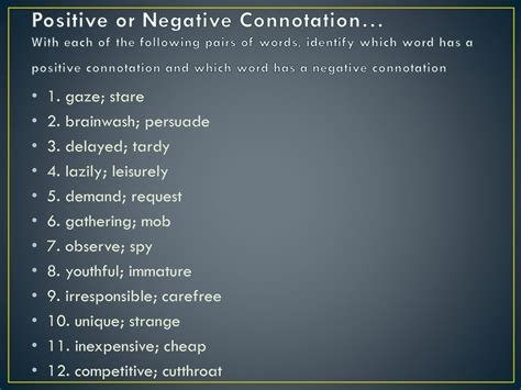 Web positive connotation examples are words that show positivity. Web list of words with positive connotations. Web revolutionary propaganda is supposed to carry a positive connotation, something along the lines of dissemination of ideas that will help people win their freedom. Cautious is just a _________ for being scared. opportunistic is just a _________ for being. This word is the other word of admiration as used in. Positive connotation is the pleasant feeling or emotion that a word evokes. If you called the same person ‘arrogant’, then you’ll be framing them. Web here we gathered the best positive word in the english language: Lots of positive adjectives, verbs, nouns and adverbs for you to use as words of. A word with a connotation that implies positive emotions or associations.