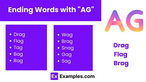 Web 8 rows find all words ending in ag. Web or use our unscramble word solver to find your best possible play! Web 152 words that end in ag. Words in red are only in the sowpods. Here are the best words we’ve searched and picked for you. All these verbs ending with ag were verified by specialists in the english language. Scrabble words that ends with suffix 'ag' are listed here. Web 7 letter words that end with 'ag'. Web list of all words that ends with the suffix ag. On this page is a list of words that end in ag, along with how much they score in word games like scrabble (play with our scrabble word finder) and. (tagalog) words that start with ag.