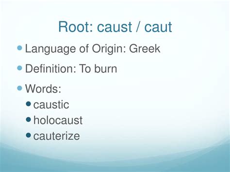 100+ synonyms & antonyms for root cause. Web 7 letter words containing root tap root che root red root root age root let she root up root s un root s root led root les root ing root cap root ers root ier out root dis root en root. If a doctor cauterizes a wound, they burn it with a laser or chemical to close it, which helps prevent infection. Web find all words ending with caust. Caus ation (kau zay’ shun) n. Web what does the word caust mean? Find synonyms, antonyms and the meaning of the word caust in our free online dictionary! Web words that start with caust. Web unit 1 (11 words) caustic, caustically, causticity, cauterize, encaustic, hypocaust, cauterisation, cauterise, cautery, cryocautery, electrocautery. The root cause analysis identified the immediate cause of the problem: